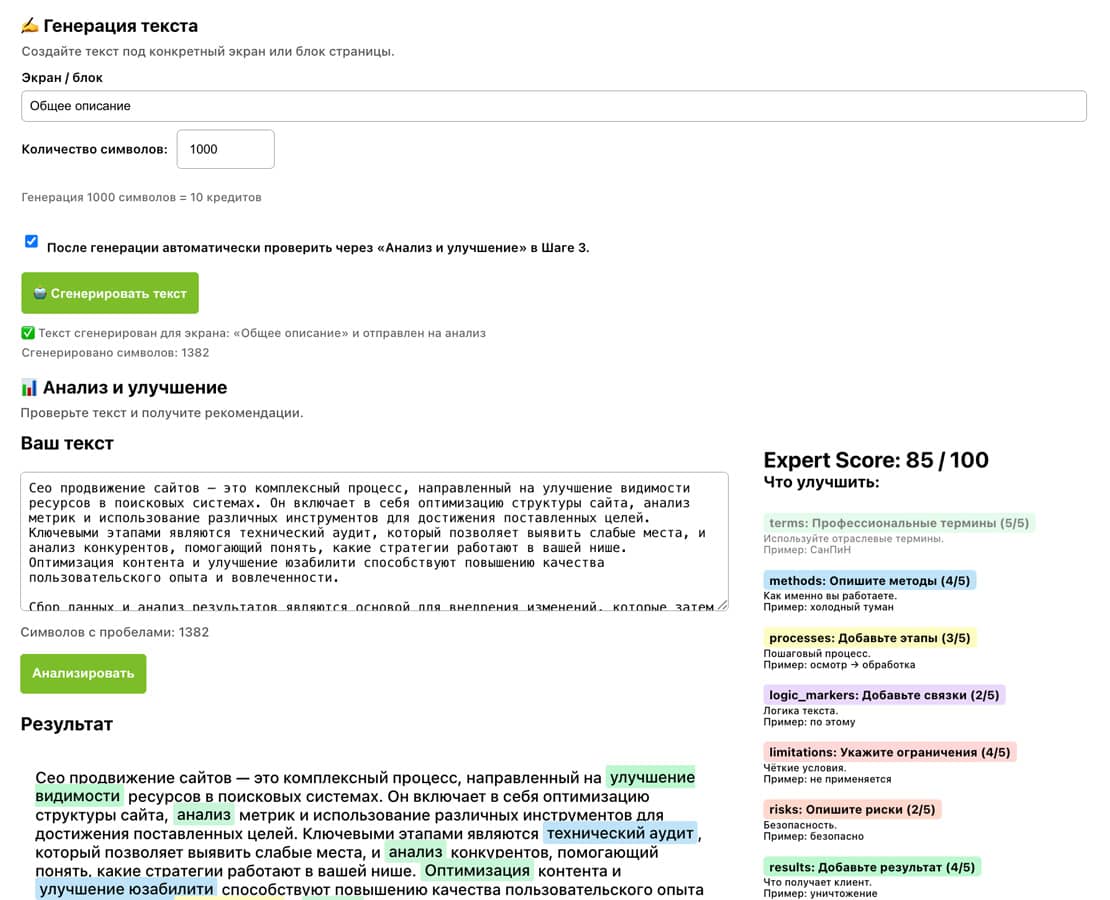 Инструмент анализа экспертности текста. Сервис показывает какие сигналы экспертности присутствуют в тексте и каких не хватает.