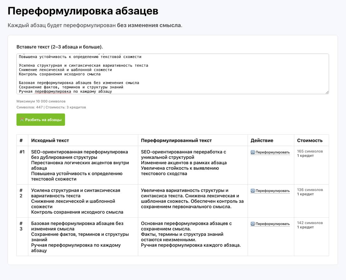 Сервис изменяет формулировки, структуру и подачу информации, сохраняя исходное содержание, факты и логику. Используется для повышения текстовой уникальности без потери смысловой точности и SEO-контекста.